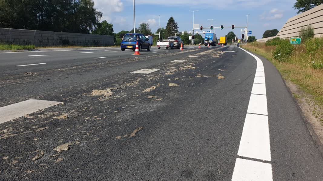 Door een nog onbekende oorzaak is er vrijdagmorgen slachtafval terecht gekomen op de N18 nabij Varsseveld. Rijkswaterstaat tast nog in het duister over de afkomst van de dierlijke resten.