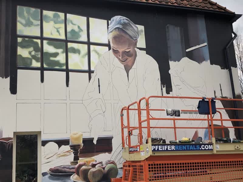 De Strakke Hand is het bedrijf van Michiel Meulemans uit Utrecht en hij wilde al langer graag een muurschildering maken in Winterswijk of Groenlo, zo weet Walterbos. "Hij is getrouwd met een Winterswijkse, een dochter van een collega van mij", zegt hij. Die collega, Annette Hakkie, is donderdagmiddag naar Groenlo gereden om het werk van haar schoonzoon te bewonderen. "Ik ben best wel trots", bekent ze lachend. "Ze maken echt hele mooie dingen, kijk maar eens op de site. Hij wil in Winterswijk, op de hoek bij de Markt, ook graag een muurschildering maken. Iets van Mondriaan."