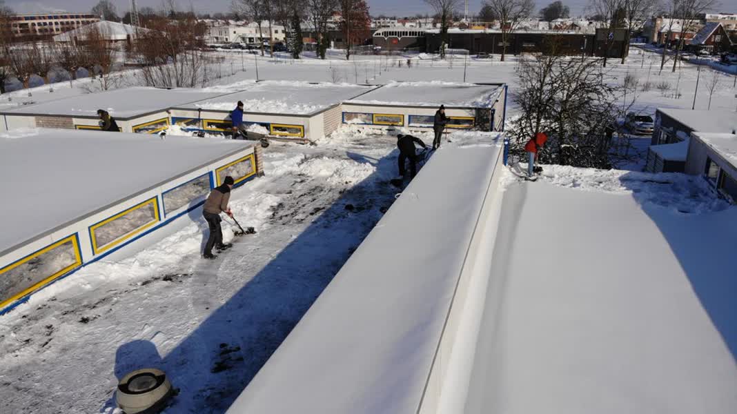 "Ons is geadviseerd dat er écht te veel sneeuw op het dak ligt voor de stalen constructie", zegt directeur Willeke van der Burg van OBS De Woelwaters. "De situatie is te onveilig om open te gaan." Hoewel het een teleurstelling was, schoten leraren en ouders dinsdag te hulp om de sneeuw van het dak te halen. "Vanmorgen ben ik toch maar vroeg uit de veren gegaan en met een sneeuwschep hiernaartoe gekomen", vertelt lerares Simone Bussink, die eigenlijk een vrije dag had. "We proberen met z'n allen gezamenlijk om het dak sneeuwvrij te krijgen."