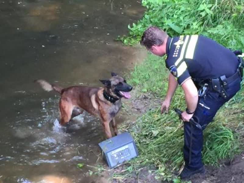 Een deel van de inhoud van de kluis werd al teruggevonden. De kluis zelf moest nog worden gevonden. "Onze collega met de politiehond was ook in dienst. Die hond gaf op een gegeven moment aan dat er iets in het water moest liggen. De brandweer heeft vervolgens voor ons die kluis geborgen. We zijn nog niet helemaal klaar, maar proberen de zaak vandaag helemaal af te ronden."