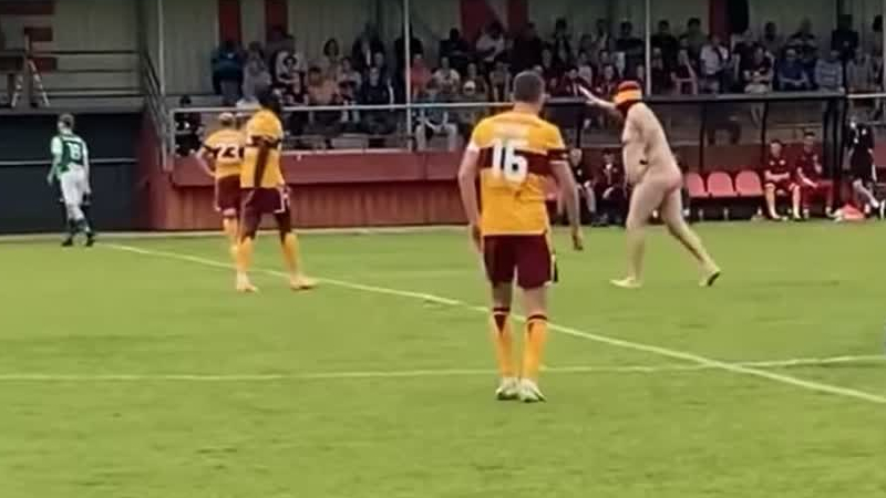 Een streaker is dinsdagavond het veld opgerend tijdens de oefenwedstrijd van HSC'21 tegen Motherwell...