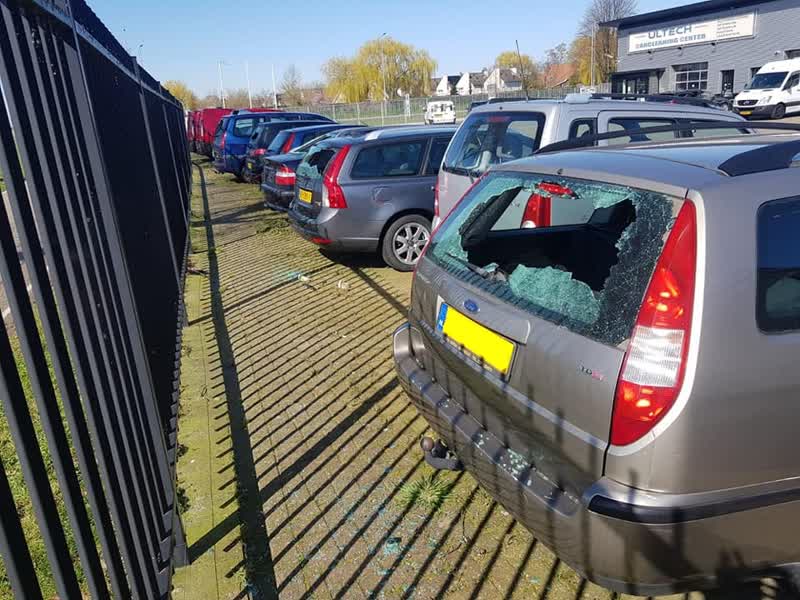 “Ik vind het jammer dat zoiets gebeurd”, zegt eigenaar Gertjan Vredegoor van het autobedrijf aan de Berghseweg. “Ik krijg er een raar gevoel van, want wie doet zoiets?” Op camerabeelden is te zien dat een auto rond 23.30 uur ’s avonds parkeert bij het bedrijf. Vervolgens stappen twee personen uit die stenen door de ruiten van acht auto’s gooien.
