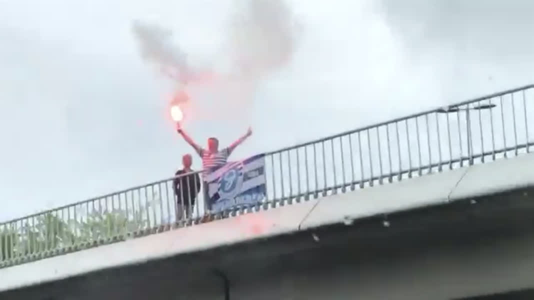 De supporter stond gehuld in Graafschap-kleuren en met een brandende fakkel in de hand op een viaduct bij Arnhem-Noord, op het moment dat de supportersbussen van De Graafschap passeerden. De eenmansactie werd vastgelegd door verschillende supporters in de bussen.