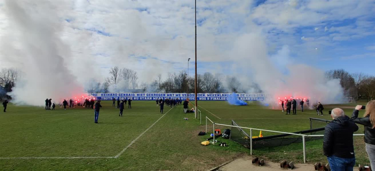 De grote groep supporters was naar het trainingsveld bij De Bezelhorst gekomen. Met fakkels, het afsteken van vuurwerk en gezang hoopten ze de spelersgroep en staf te motiveren voor de laatste negen wedstrijden van de reguliere competitie. Met een groot spandoek, van 140 bij vijf meter, refereerden ze onder meer aan het vorige seizoen waarin de club door de coronacrisis en de daaropvolgende beslissing van de KNVB promotie misliep. De boodschap op het doek: 'Trots op dat we nu staat waar we toen stonden, nog 9 finales op weg naar het ultieme doel'.