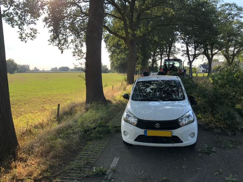 Een auto heeft maandagavond flinke schade opgelopen nadat er een tak vanuit een boom tegen de auto viel nabij Sinderen. De bestuurder van het voertuig is hierbij niet gewond geraakt.