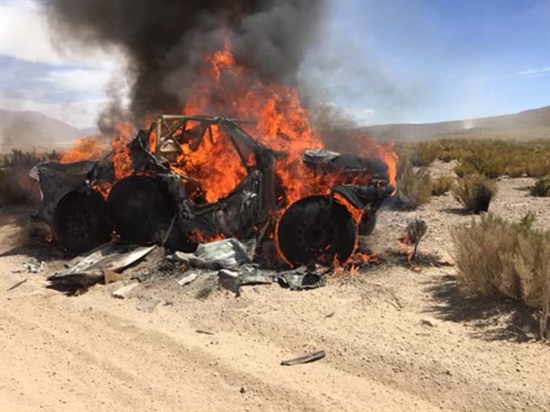 Ten Brinke moest tijdens de rit een band verwisselen. Enkele minute na de stop roken de bestuurders een brandlucht. Het kapotte wiel bleek in brand te staan, waarna het vuur zich razendsnel verspreidde. “We hebben geprobeerd te blussen, maar de auto vloog direct in brand. Tom en ik mankeren niets, maar we zijn er wel ontzettend ziek van’’.