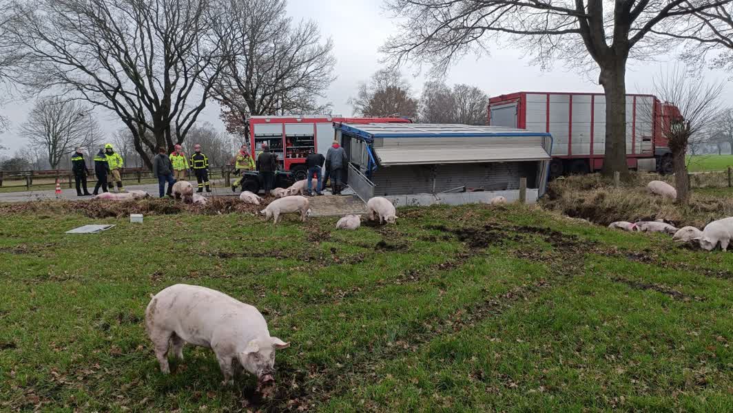 Het ongeval gebeurde rond 13.15 uur op de kruising van de Zieuwentweg in het buitengebied van Halle. De vrachtwagenchauffeur was onderweg van Halle en wilde linksaf de Zanddijk op rijden. Daarbij is de aanhanger met de varkens gaan kantelen en terechtgekomen in een weiland. De brandweer en een veearts zijn ter plaatse gekomen om de beesten uit de aanhanger te helpen.