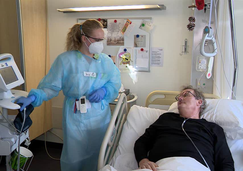 Op één van de kamers van de covid-afdeling ligt Willem uit Dalfsen. Zijn vrouw zit naast zijn bed. De patiënten mogen maximaal twee bezoekers per dag ontvangen. “Ik vind het fijn dat ze er is”, zegt Willem. “Dan heb ik toch nog iemand bij me en dat is toch een hele troost met kerst.” Inmiddels ligt hij al vier weken in het ziekenhuis. Eerst in coma op de IC, waarna hij op de verpleegafdeling voor coronapatiënten terecht kwam. Willem baalt er van tijdens de kerstdagen niet thuis te kunnen zijn. “Je mist je familie, kinderen, kleinkinderen en het samen zijn. Dat is niet leuk.”