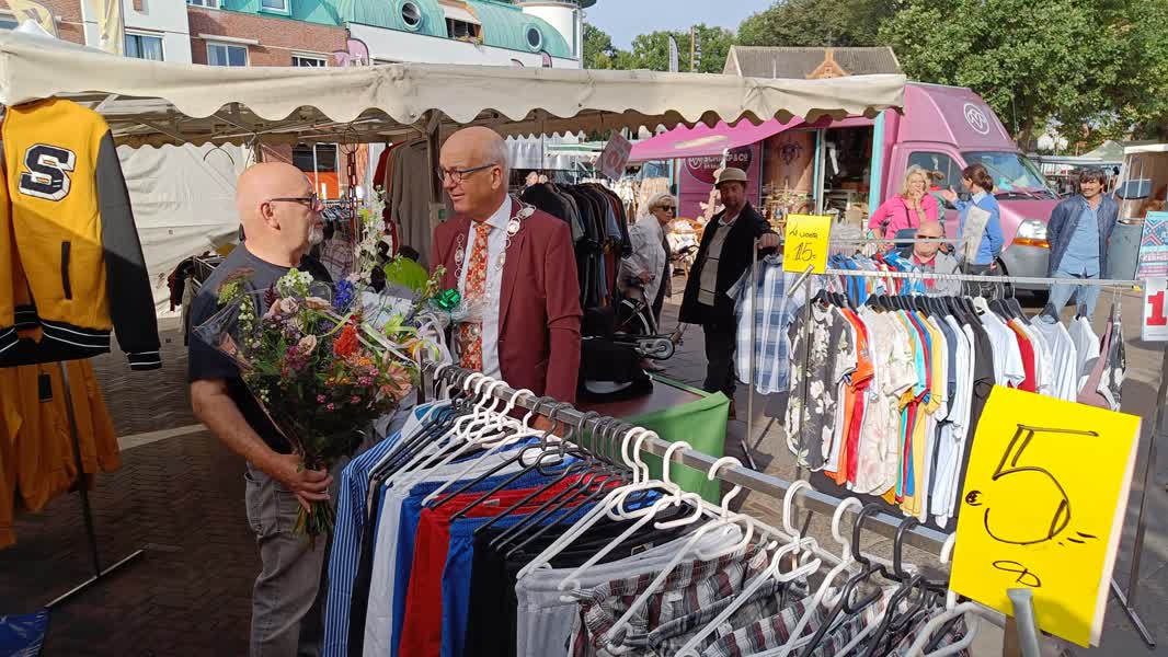 Ook de burgemeester van Montferland kwam langs om de Dinxperlose kraamhouder te bedanken, én om een cadeautje te overhandigen. “Je kan het je niet voorstellen dat iemand 54 jaar op de markt komt, dag in en dag uit, want hij staat natuurlijk op veel markten”, aldus Harry de Vries, die geen nieuw setje kleren uitzocht in de kraam. “Ik weet niet of het helemaal mijn stijl is, maar dat geeft niet. Ik hoop dat hij nog veel aan de man kwijtraakt.”