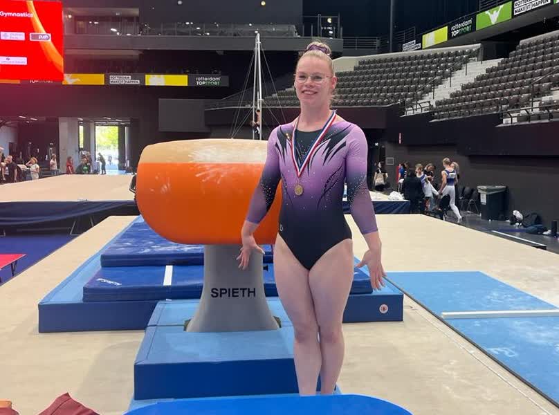 Er was nog meer 'Achterhoeks' succes op het toernooi. Naomi Visser traint bij de Top Turnacademie Achterhoek in Varsseveld en wist eerste te worden in de hoogste categorie voor dames: de eredivisie. Dat niveau behalen is voor de 22-jarige Rachel geen optie meer: "Dan moet je als klein meisje eigenlijk al bij de eredivisie zitten, dat is voor mij niet haalbaar omdat ik al ouder ben." Een Olympische droom heeft Rachel dan ook niet. Met het behalen van de Nederlandse titel in de eerste divisie heeft zij het voor haar hoogst haalbare doel in de sport behaald.