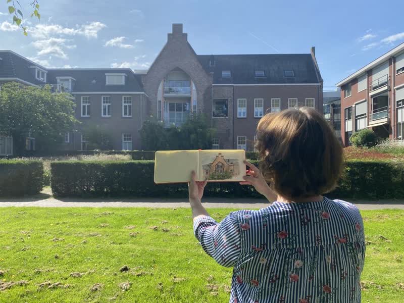 “Door corona had ik het heel erg moeilijk en ik zocht een weg om daar mee om te gaan”, vertelt de kunstenares. “Ik kon geen mensen meer ontvangen voor het schilderen van mijn portretten en ben daarom gaan wandelen. Ik wilde mijn creativiteit en het wandelen combineren, toen kwam ik Urban Sketching tegen en dacht: dit ga ik doen.” Wolters gaat bewapend met haar rode inklapstoel en een tas vol verfspullen op pad en maakt van verschillende plekken in Didam een schets. "We hebben zoveel mooie plekjes in Didam waar we aan voorbij lopen, maar die wel de moeite waard zijn om naar te kijken", vindt Wolters.