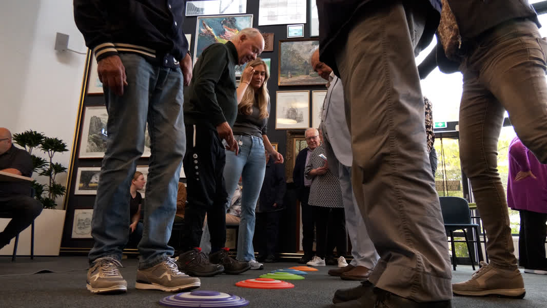De gezamenlijke aftrap in het gemeentehuis in Gendringen is een bijzondere. Koffie, cakejes en ouderen. Een combinatie die je eerder verwacht in een koffiekamer dan op maandagochtend in het gemeentehuis. De woonzorgcentra zijn leeggelopen om bij dit moment aanwezig te zijn. Op de vloer in de grote ruimte liggen verschillende lichtgevende schijven. Dit is één van de trainingen. Verderop ligt een mat van enkele meters voor de looptest. Aan wethouder Janine Kock de eer om, inclusief enkelband die alles meet, de week te openen door de test op de mat te doen. Met succes, ze slaagt met een 9,5.