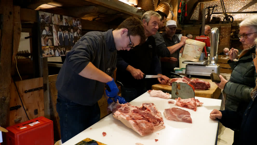 “We benen hier een heel varken uit”, aldus Lars Rossel, een van de slagers die het ambacht laat zien. “Het varken zit nog echt op de lere (Achterhoeks voor ladder), en we laten mensen zien hoe het beest in elkaar zit en hoe het wordt verwerkt.” De bezoekers konden niet alleen kijken naar de ouderwetse manier van werken, ook de smaakpapillen werden aan het werk gezet. “Je kunt hier proeven van balkenbrij, bakbloedworst, rookworst, leverworst, metworst, noem maar op,” vertelt Dick Diepenbroek, vrijwilliger van Het Hofshuus, een kijkje in de keuken gevend.
