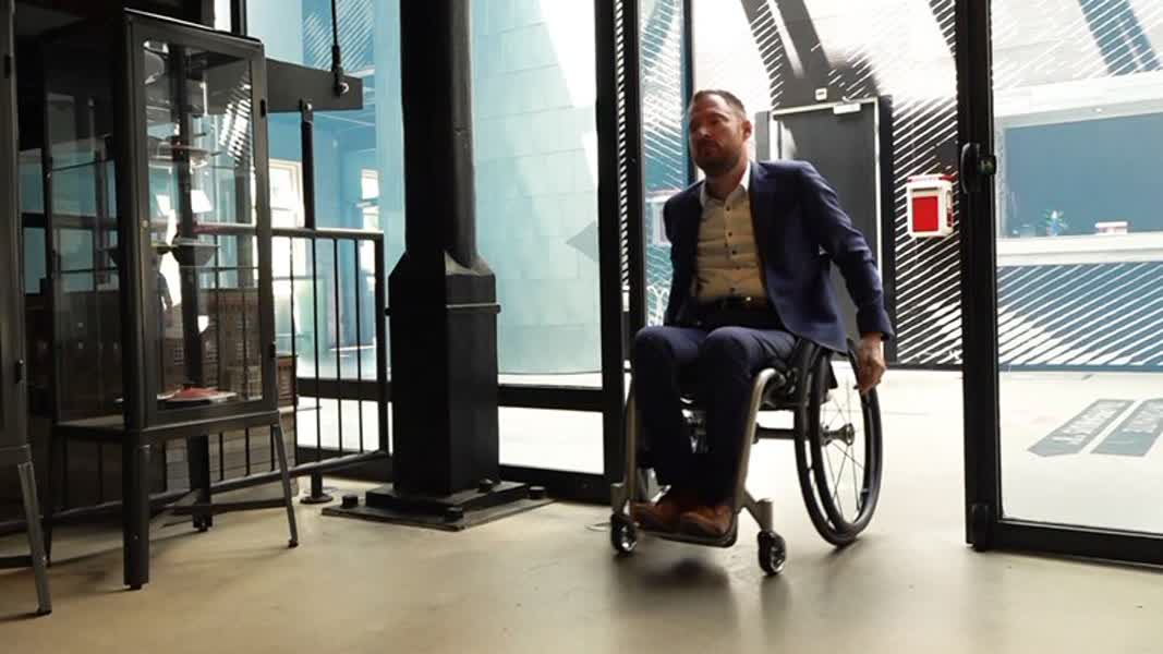 De toegankelijkheid van het stokoude gebouw is geheel aangepast voor mensen met een beperking. "Het zijn natuurlijk schuifdeuren", zegt de burgemeester als hij zijn rolstoel naar binnen duwt. Aan de deur hangt een bordje dat honden verboden zijn, maar daarboven hangt een groter bord waarop staat dat hulphonden wel naar binnen mogen. "Hier zit de bibliotheek, het theater, de gemeenteraad en een popzaal. Daar moet iedereen natuurlijk naar toe kunnen. Dit verdrag helpt de plekken die nog niet zo goed toegankelijk zijn om die toegankelijker te maken", aldus van Dijk.