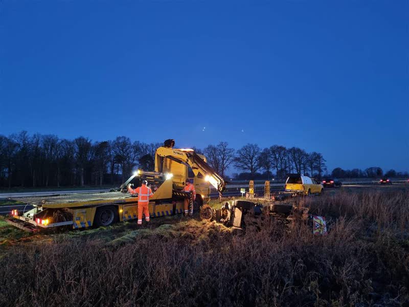 Het incident gebeurde rond 06.45 uur. Een bedrijfsbus reed met een aanhanger, waarop een veegmachine stond, in de richting van Neede. Net voorbij de afslag van Eibergen is het voertuig aan het slingeren geraakt. Toen de combinatie in de berm terecht kwam, schoot de veegmachine los van de aanhanger en eindigde in een naast de weg gelegen weiland.