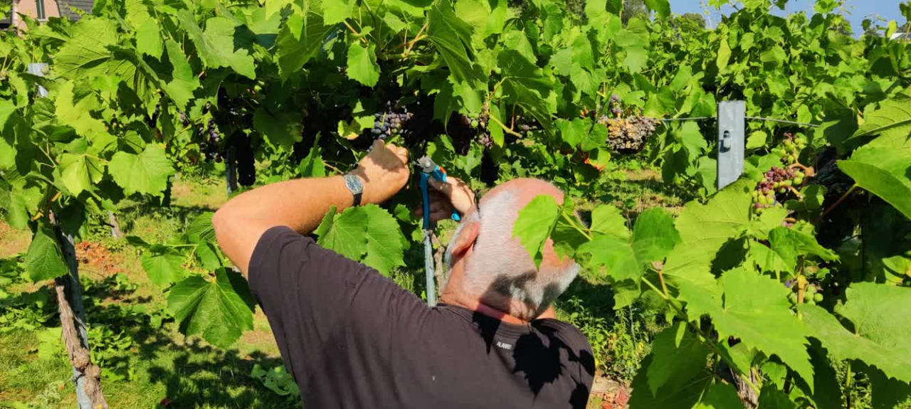 "De wortels die groeien naar het grondwater toe, dus de droogte is geen probleem", laat de wijnboer weten. "Ik hoef hier ook nooit te sproeien, dus dat is gunstig." Op zijn wijngaard werkt Jansen met de 'gordijnmethode', het bladerdak boven de druiven zorgt voor bescherming tegen de felle zon. De biologische wijnboer is tot nu toe erg positief over 2022 als wijnjaar in de Achterhoek. "De temperatuur is redelijk constant, soms is het wel een beetje erg warm zoals de afgelopen periode, maar dankzij de gordijnmethode hebben wij geen last van druiven die door de zon verbranden. Die hangen onder een bladerdek", vertelt de wijnboer. "De weersomstandigheden zijn ook reden voor minder schimmels, dat is voor ons als biologische wijngaard wel gunstig. Anderen hebben daar geen last van, want die kunnen wel chemisch bestrijden."