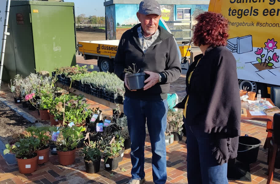 “Mensen moeten zich realiseren dat een betegelde tuin heel veel warmte vasthoudt en je hebt natuurlijk veel minder bijen en vlinders”, vertelt Wolsing. “En het zorgt er ook voor dat het water de grond niet in gaat, maar wegspoelt. Dus het is het is superbelangrijk om zoveel mogelijk tegels uit je tuin en de plant er in te doen.” In Braamt zijn zo’n dertig mensen gekomen om een tegel in te ruilen. Zo ook Lupko te Ronde: “Je ziet steeds meer huizen met alleen maar tegels in de tuin en ik vind dat echt zonde.”