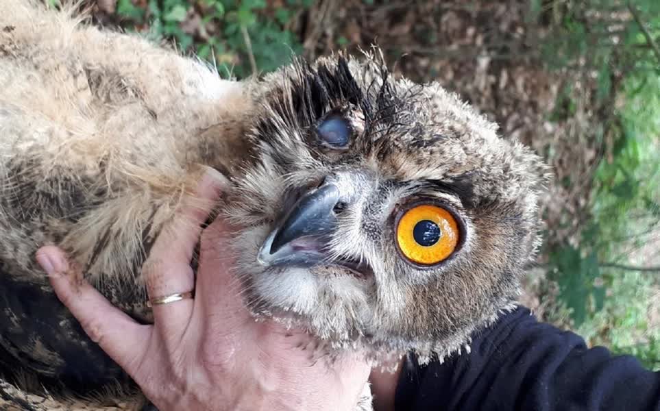In een bosgebied bij Winterswijk is donderdag een verzwakte oehoe gevonden. Het jonge dier is blind aan één oog en is opgevangen door de Dierenambulance.