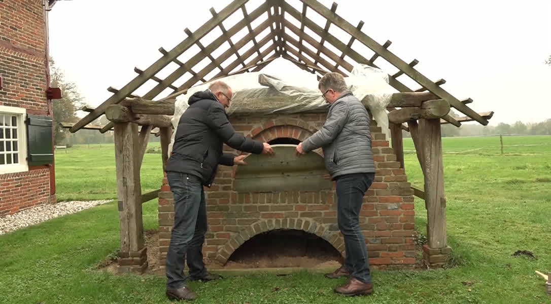 Samengeknepen billenDe oven wordt nu in zijn geheel verplaatst. Althans, de dakpannen zijn verwijderd en de erfgoedklusbrigade is druk met het verwijderen van de gebinten. Wat dan overblijft, is de stenen oven. Die wordt in zijn geheel opgehesen en dat zorgt toch wel voor samengeknepen billen bij Te Kulve: "De vraag is hoe het met het fundament zit", legt hij uit. "Straks worden er ijzeren balken onder de oven geschoven. Het is al spannend om te zien of dat lukt. En daarna wordt hij op een dieplader getakeld en we weten gewoon niet hoe dat gaat verlopen."