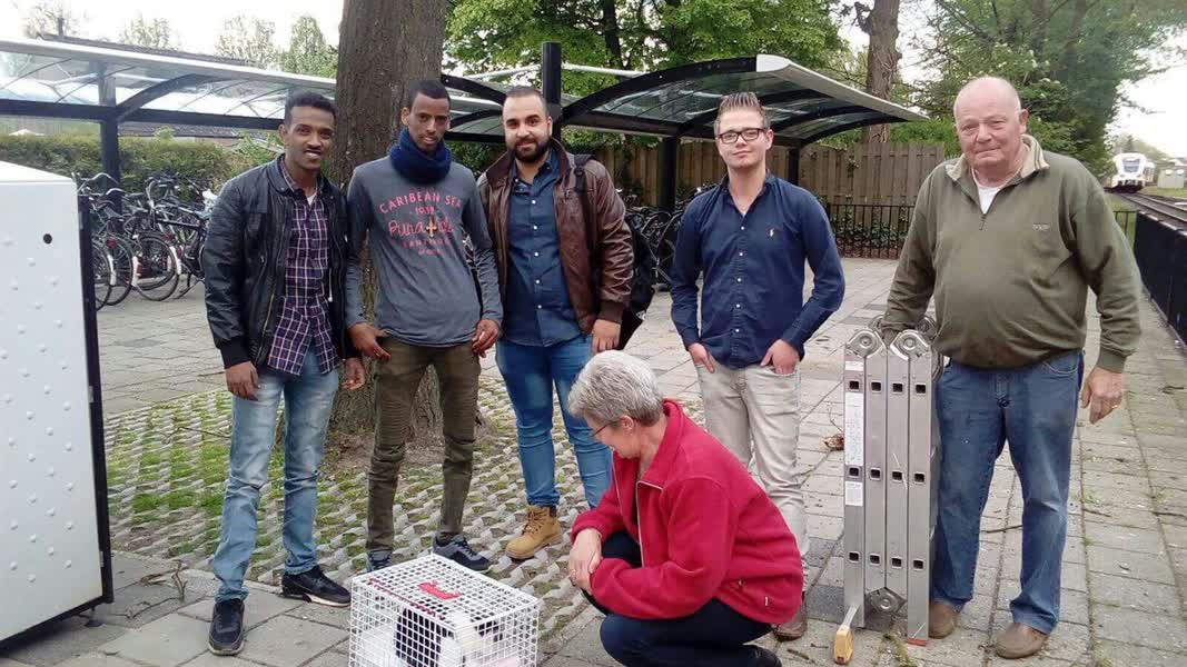 De brandweer staakte de reddingspoging, maar enkele mannen niet. De lokale helden, volgens omstanders vluchtelingen, klommen met behulp van een ladder naar de top van de boom en wisten dankzij een vangnet het beestje veilig aan de grond te krijgen.