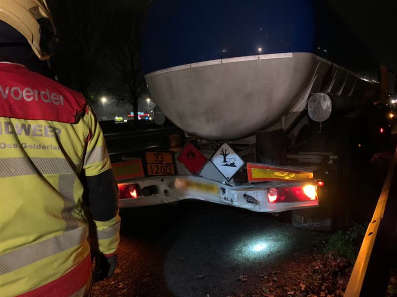 Een vrachtwagen is donderdagavond van achteren aangereden op de snelweg A12 ter hoogte van de afrit Zevenaar. Er was even onrust of er wellicht een gevaarlijk stof zou lekken, maar dat bleek niet het geval.