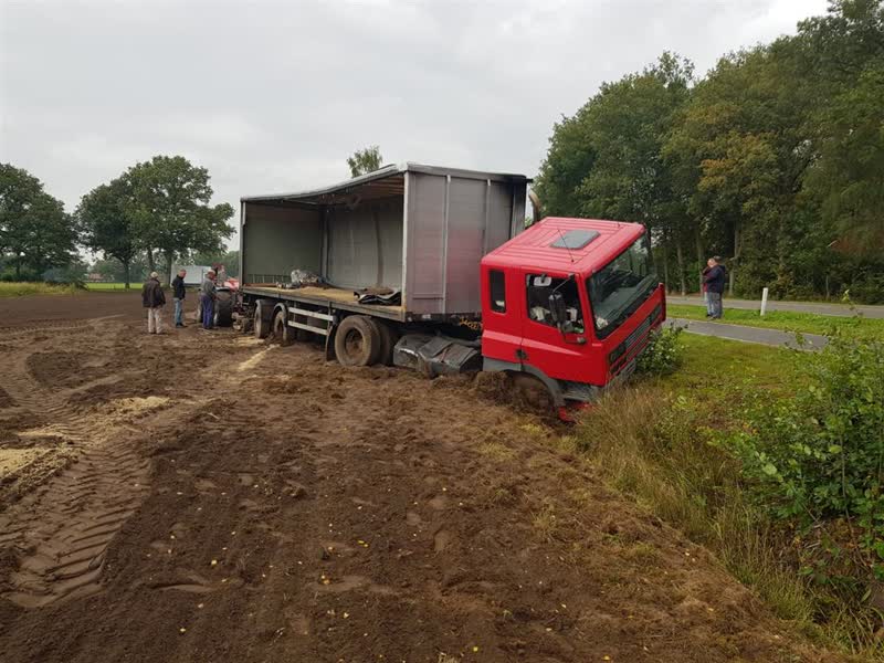 Een vrachtwagen met trailer is donderdagmiddag gekanteld en deels in een sloot terecht gekomen bij Neede. Het voertuig schoot in een bocht rechtdoor en eindigde naast de weg.