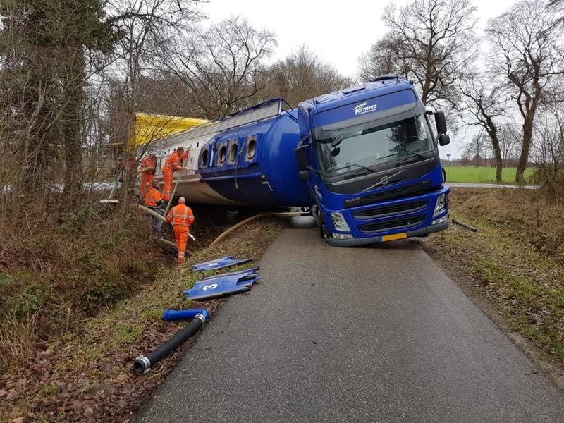 Het ongeval gebeurde rond 07.00 uur. De chauffeur van de vrachtwagen wilde rechts afslaan de Diekerweg op. Vermoedelijk draaiden niet alle assen van de vrachtwagen mee, waardoor het voertuig de bocht niet haalde en op zijn kant in de sloot belandde.