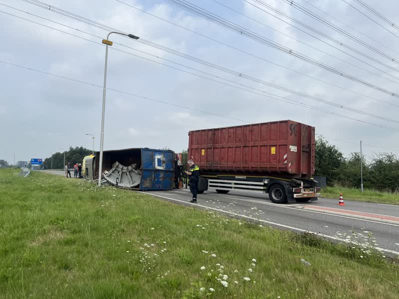 Het eenzijdige ongeluk gebeurde even na half een zaterdagmiddag. Door een nog onbekende oorzaak verloor de chauffeur de macht over het stuur in de bocht en kantelde de vrachtwagen. De chauffeur wist via een dakraam uit de vrachtwagen te komen. De chauffeur is door ambulancepersoneel nagekeken en behandeld.