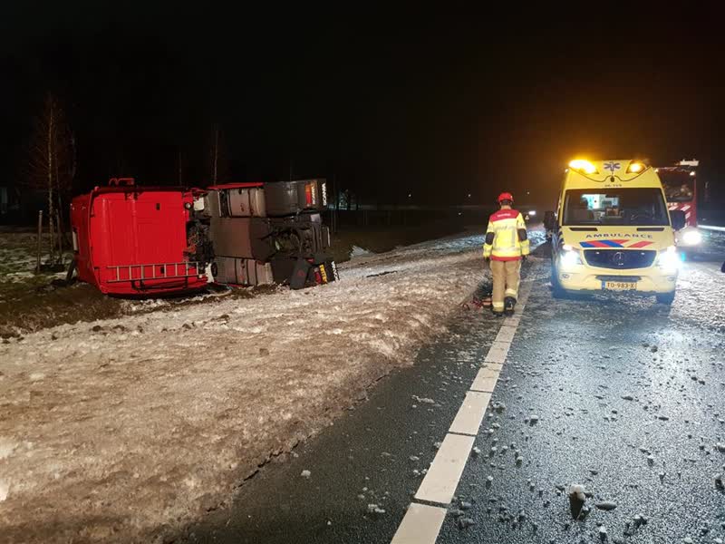 De vrachtwagenchauffeur raakte rond 20.45 uur van de weg en kwam over dwars en op de zijkant in de berm terecht. Volgens de politie ter plaatse werd het eenzijdige ongeval veroorzaakt door de gladde weg. Het verkeer werd na het ongeval, ter hoogte van De Laarberg bij Groenlo, een tijdlang omgeleid via de oude N18.