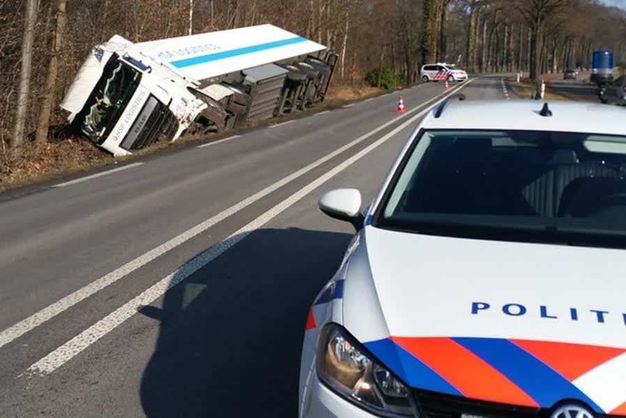 Op de Misterweg in Winterswijk is een vrachtwagen door nog onbekend reden in de berm terecht gekomen. Het grote voertuig ligt op zijn kant in de berm langs de N318.
