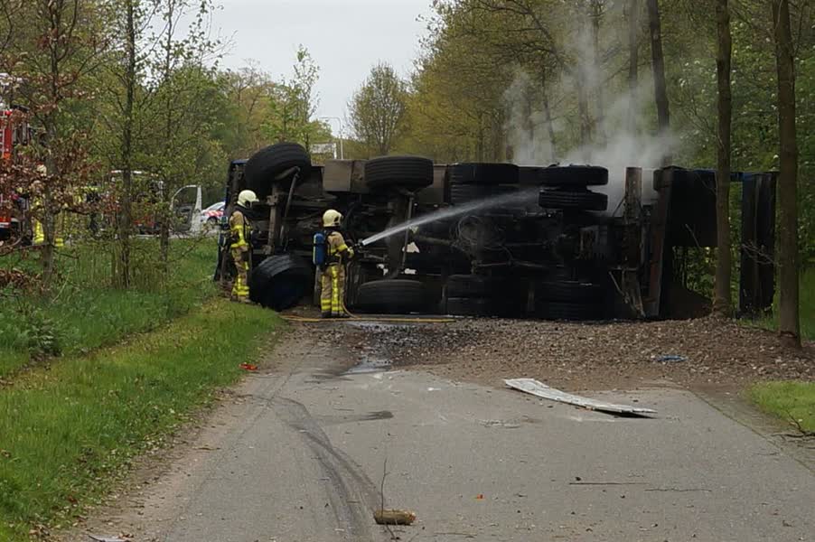 Het ongeval gebeurde maandag rond het middaguur. De vrachtwagen kwam in een bocht door nog onbekende oorzaak in de berm terecht, vervolgens schaarde het voertuig en eindigde uiteindelijk op de zij op de parallelweg. Een deel van de lading, grof puin, kwam daarbij op het wegdek terecht.