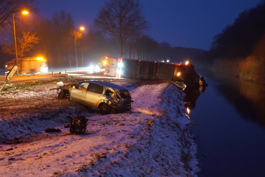 De automobilist wilde rond 07.00 uur vanuit het dorp de Ruurloseweg oversteken, maar zag daarbij een van links komende vrachtwagen over het hoofd met de aanrijding tot gevolg. De vrachtwagen kantelde vervolgens en gleed door. Uiteindelijk kwam deze in het water tot stilstand.