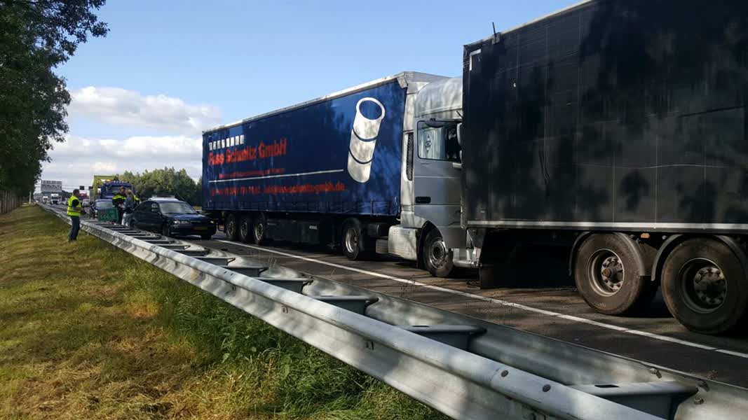 Het ongeval gebeurde dinsdagmiddag omstreeks 15:10 uur. Door nog onbekende oorzaak kwamen de vrachtwagens met elkaar in botsing. Een achterliggende automobilist kon de laatste vrachtwagen niet meer ontwijken en kwam met zijn voertuig klem te zitten tegen de vangrail. Er zijn geen gewonden gevallen bij de botsing.