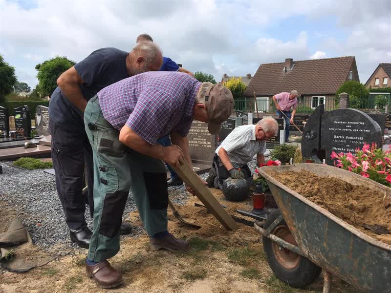 Een tiental vrijwilligers heeft donderdagochtend de schade aan de graven op de begraafplaats in Beek hersteld. Door de hoosbui van een week geleden, waarin zeker 60 millimeter regen viel, werd de grond onder meer dan twintig graven weggespoeld.