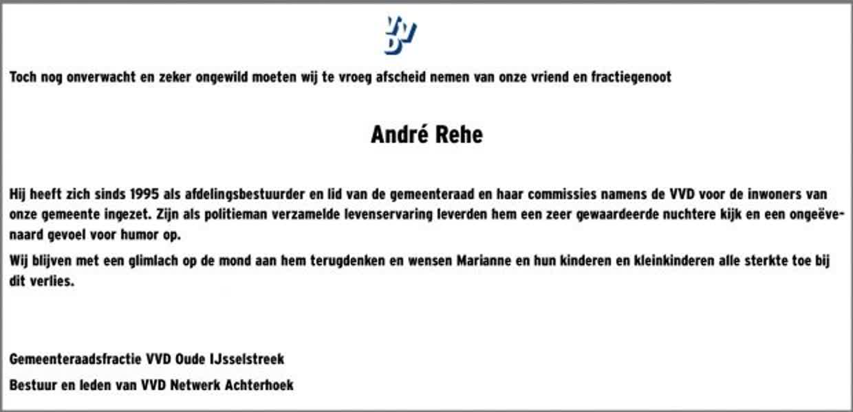 ''Toch nog onverwacht en zeker ongewild moeten wij te vroeg afscheid nemen van onze vriend en fractiegenoot'', schrijft de VVD. ''Hij heeft zich sinds 1995 als afdelingsbestuurder en lid van de gemeenteraad voor de inwoners van onze gemeente ingezet. Wij blijven met een glimlach op de mond aan hem terugdenken en wensen Marianne en hun kinderen en kleinkinderen alle sterkte toe bij dit verlies.''