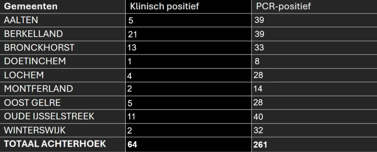 blauwtongbesmettingen per plaats. Uit de laatste cijfers blijkt dat er 1723 besmettingen in Nederland zijn, vooral in Overijssel, Gelderland, het oosten van Noord-Brabant en het noorden van Limburg. In de Achterhoek staat de teller inmiddels op 325 gevallen. Het dorp Aalten spant de kroon met maar liefst 38 blauwtongbesmettingen.