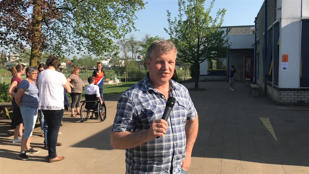 De laatste slingers en ballonnen worden nog snel opgehangen door de leerlingen van groep 8. Dan is b...