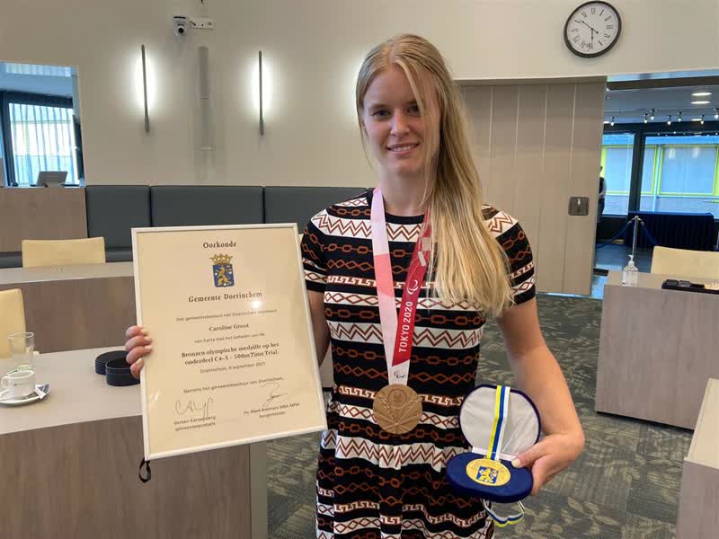 Baanwielrenster Caroline Groot is donderdag door de gemeente Doetinchem gehuldigd met een sportmedaille. Ze veroverde op de Paralympische Spelen in Tokio een bronzen medaille op de vijfhonderd meter.