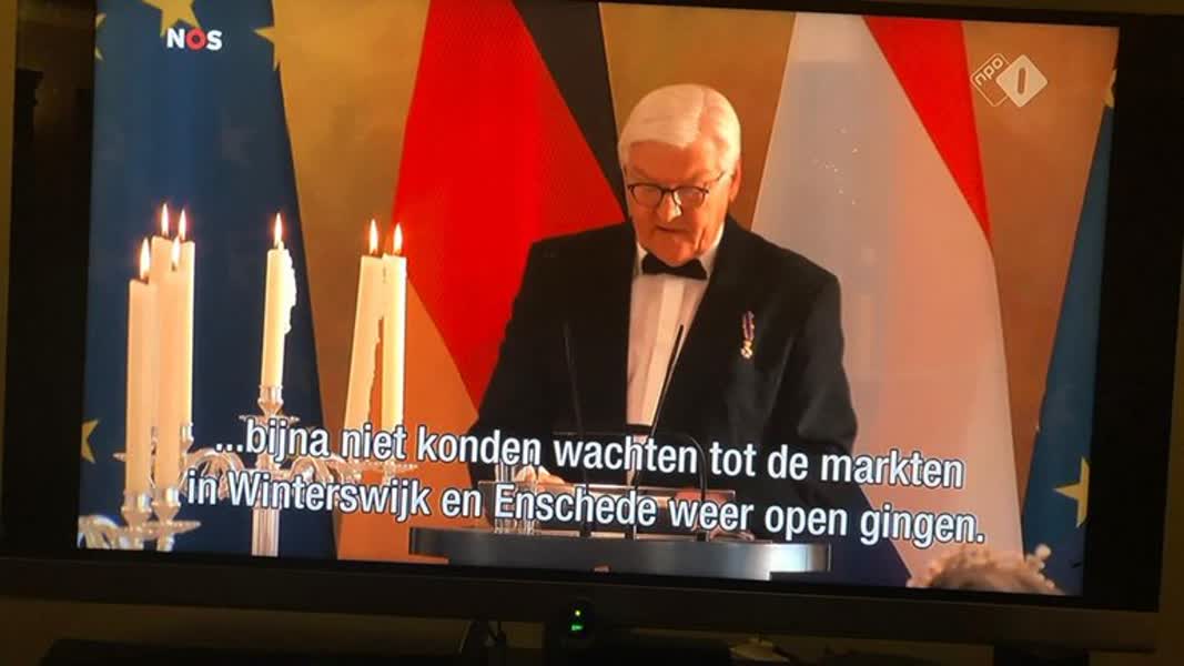 President Steinmeier noemde tijdens het staatsbanket in Slot Bellevue, zijn ambtswoning in Berlijn, Winterswijk als eerste in de rij. Pleiter: "Het is een waanzinnig compliment dat je als eerste wordt genoemd. Het geeft iedereen die eraan bijdraagt een boost. Wat zo'n simpel zinnetje niet kan doen." Ook burgemeester Joris Bengevoord liet weten trots te zijn via