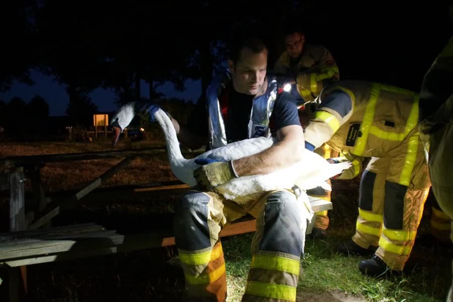 Een visser ontdekte de zwaan omstreeks 22.00 uur in een watertje aan de Hoge Weg. Het beestje was vast komen te zitten in visdraad en kon niet meer vrijkomen. Uiteindelijk hebben brandweerlieden en medewerkers van de Dierenambulance de zwaan met behulp van een boot uit het water gehaald.